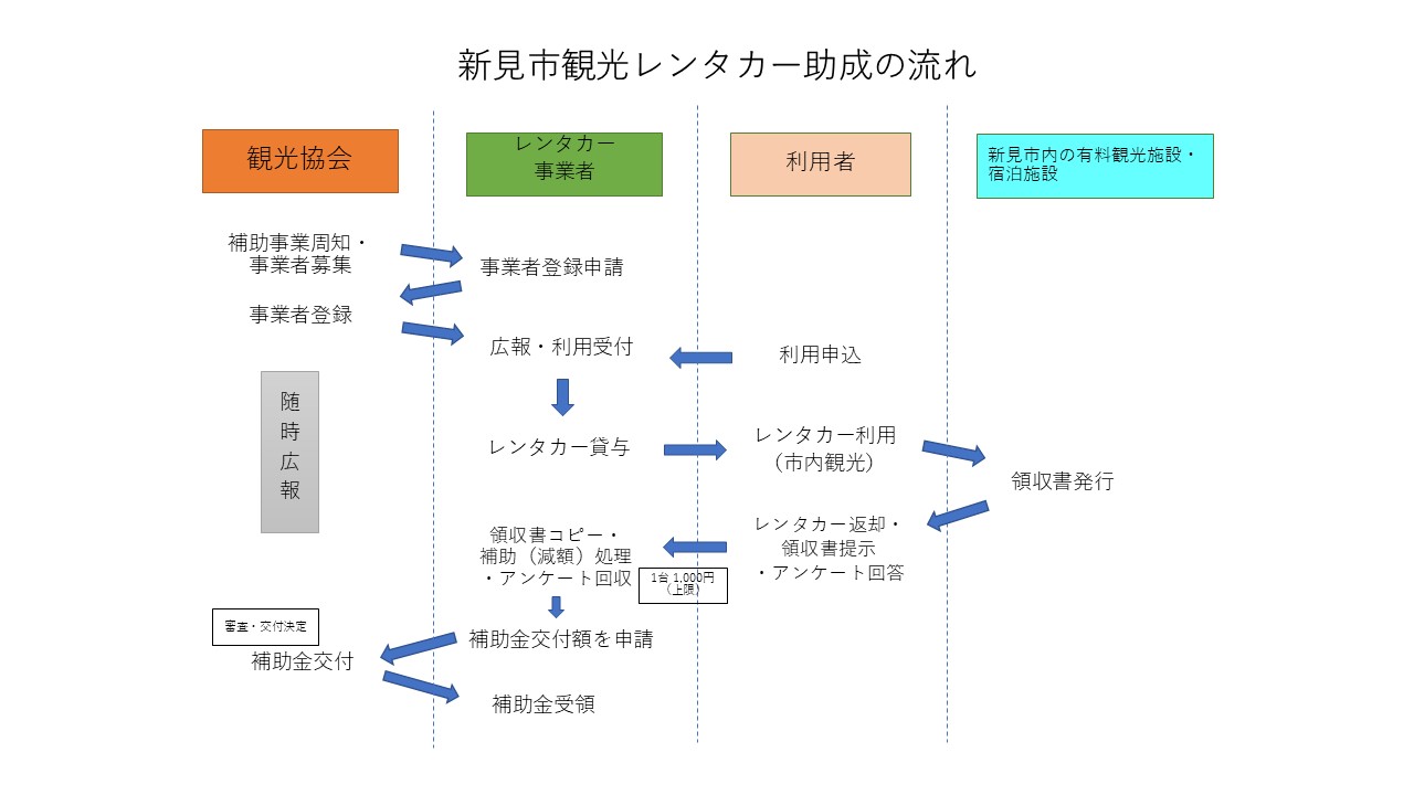 期間中に、新見市内を観光することを目的にレンタカーを利用した場合、1台につき1,000円(新見市内宿泊施設で宿泊した場合は2,000円)を助成する。