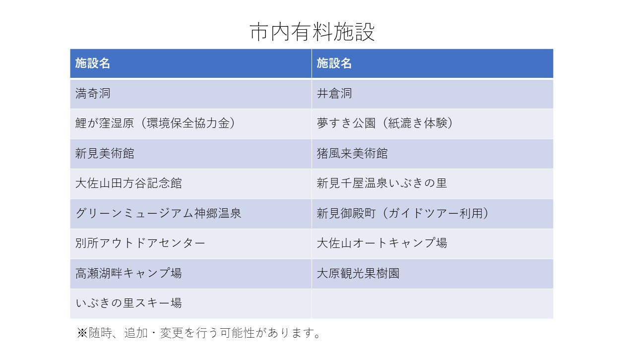 ② 岡山県内において、出発および返却が行われるレンタカーりようであり、かつ、新見市内の有料観光施設を1箇所以上利用すること。